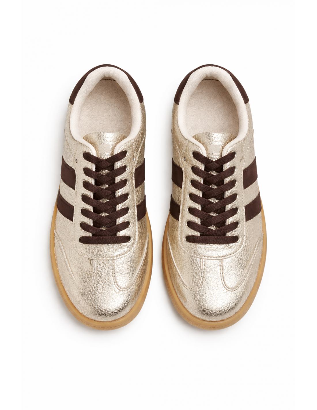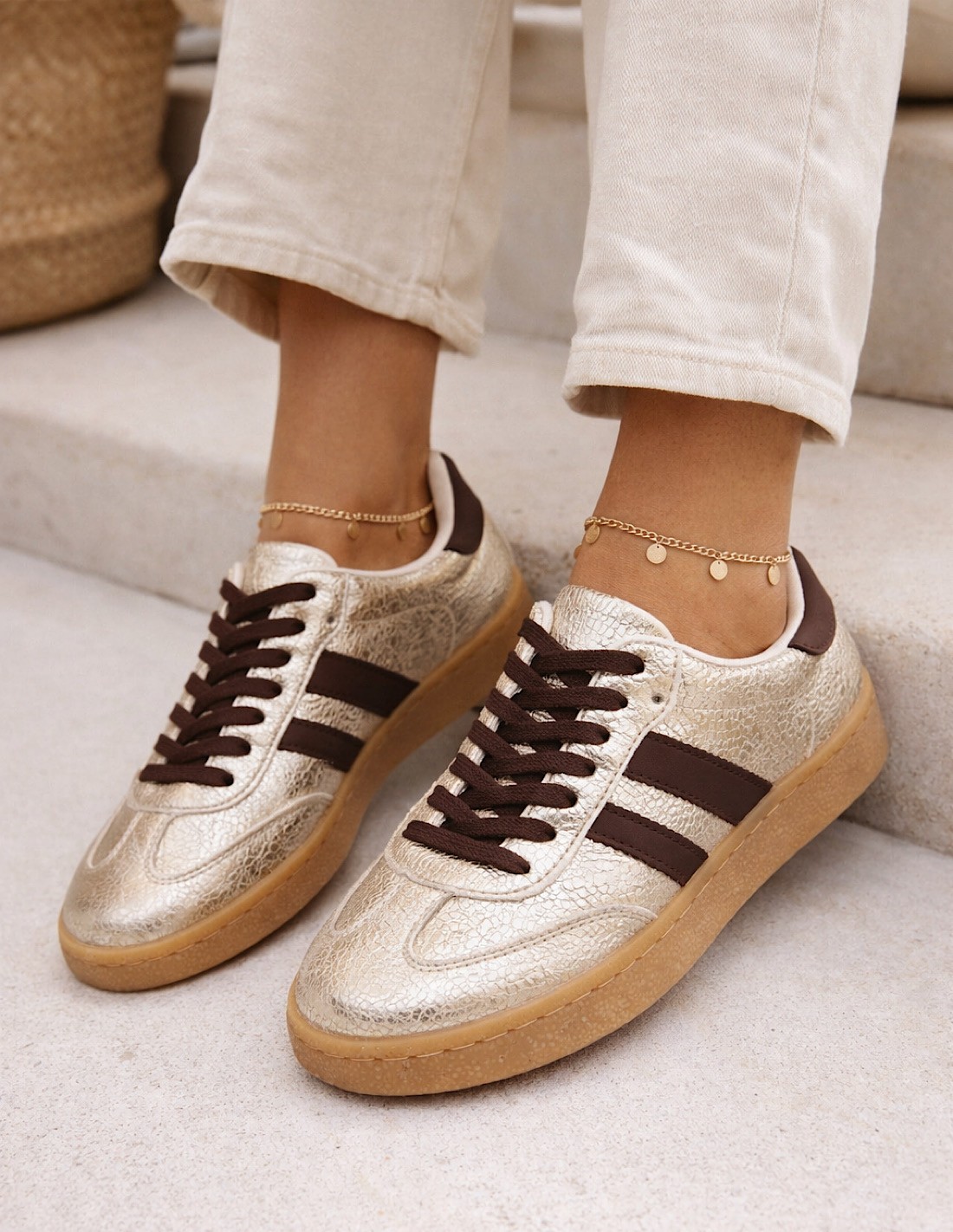 Baskets femme dorées tendance – sneakers chic effet craquele a bandes marron