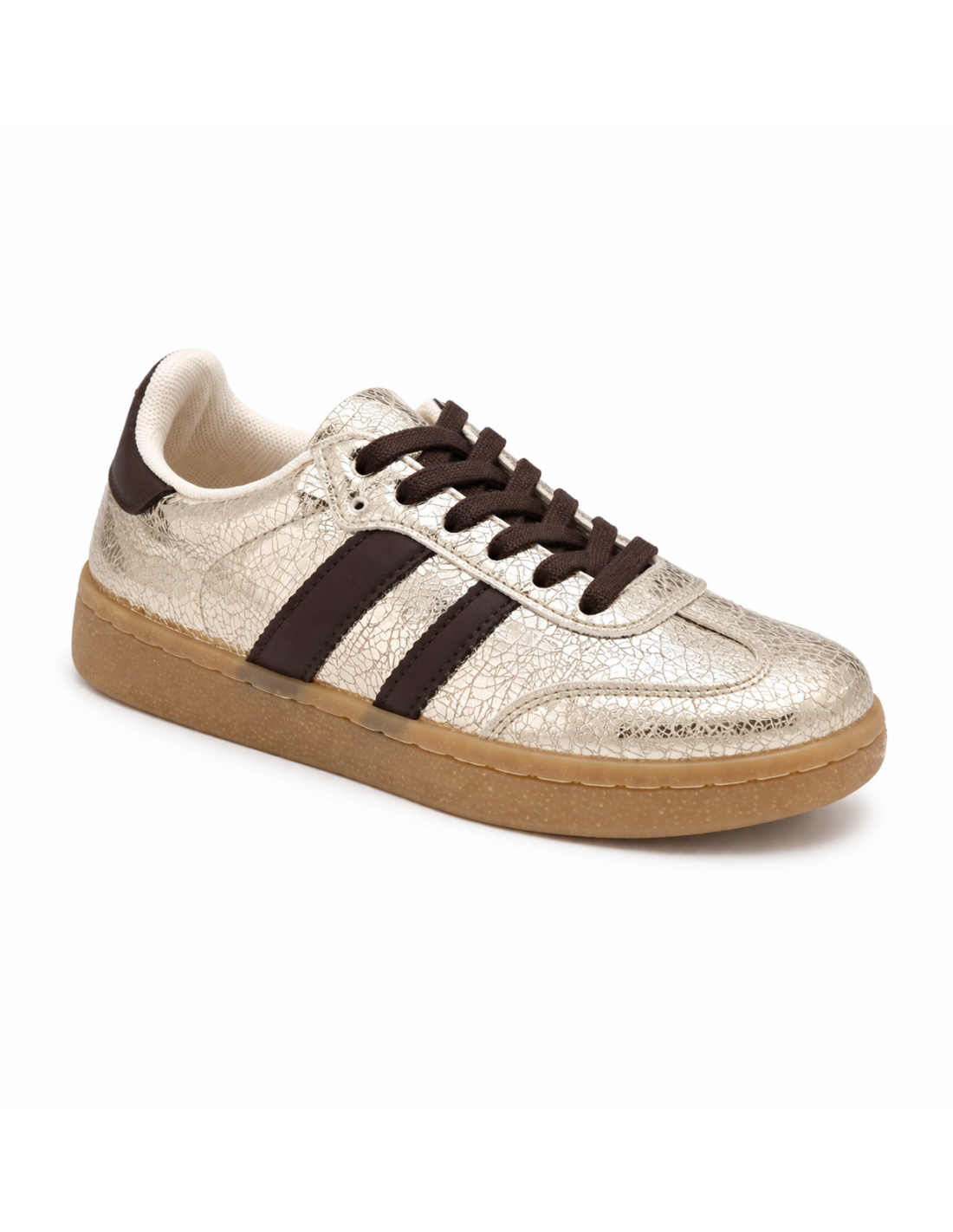 Faites la différence avec ces baskets femme dorées tendance, véritable must have pour un look moderne et élégant. Avec leur effet craquelé métallise et leurs bandes marron, ces sneakers femme chic captent la lumière et subliment instantanément vos tenues.