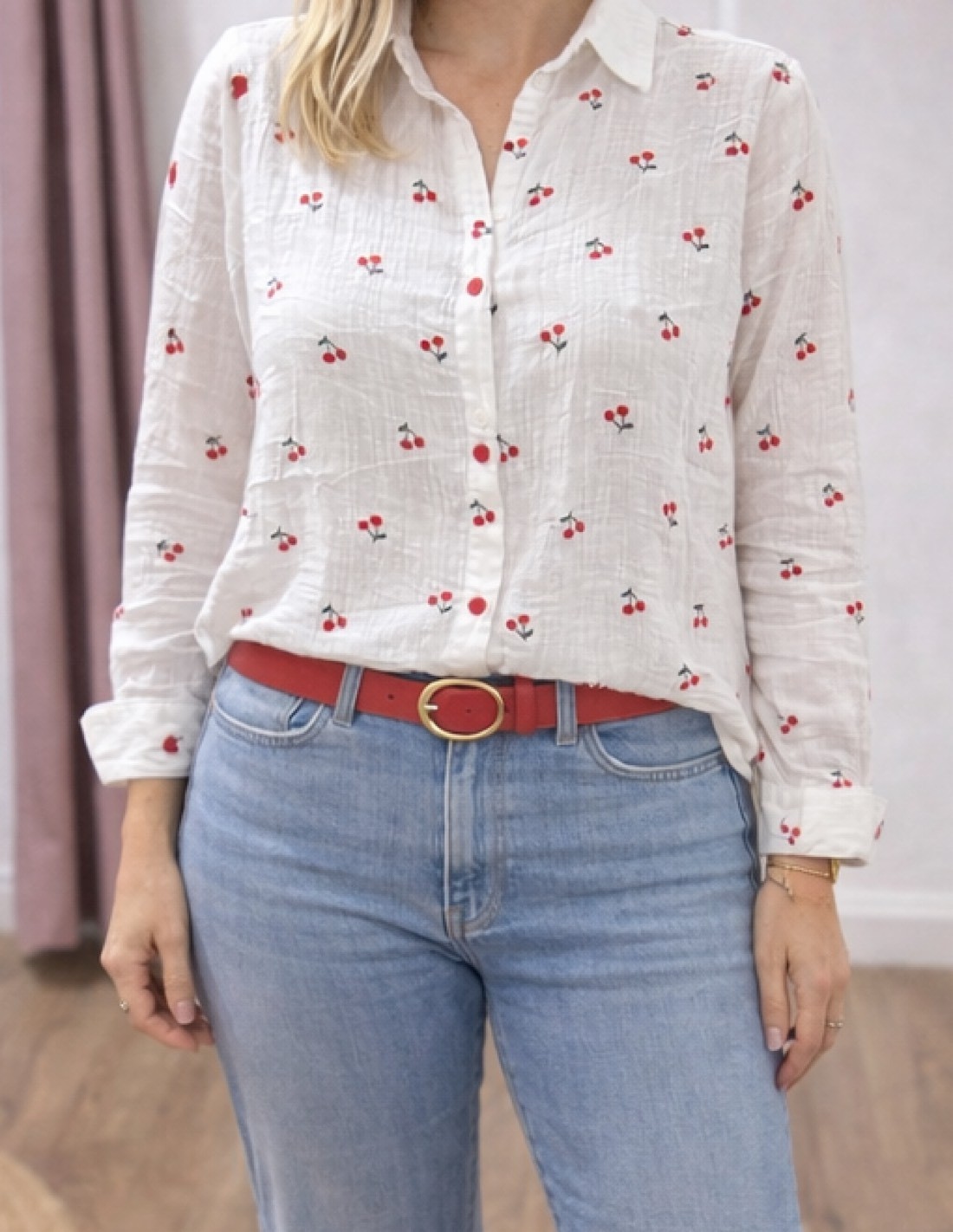 Craquez pour cette chemise femme en gaze de coton blanche imprimée cerises, une pièce à la fois douce, légère et ultra tendance.