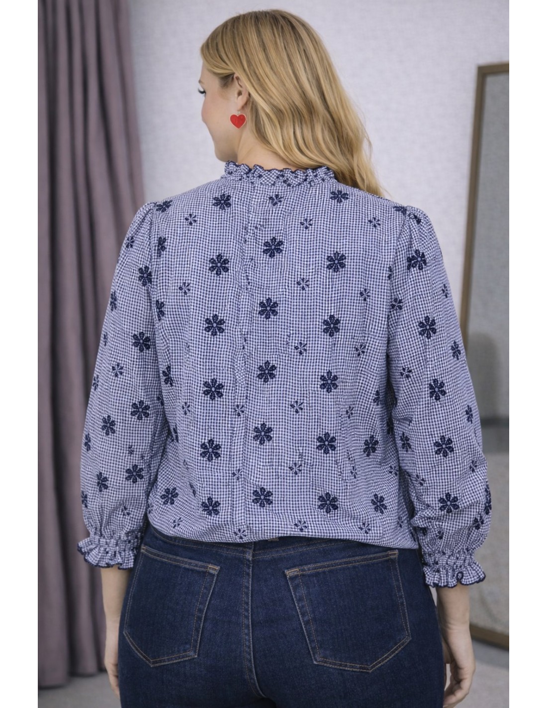 Blouse femme vichy volantée à fleurs brodées en coton du 34 au 50