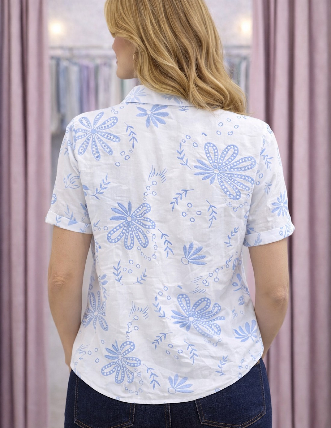 Les broderies florales apportent une touche romantique et moderne. Ce motif délicat renforce l’élégance naturelle de la pièce et la distingue d’une chemise classique. Les manches courtes et le col structuré ajoutent une finition soignée et intemporelle.