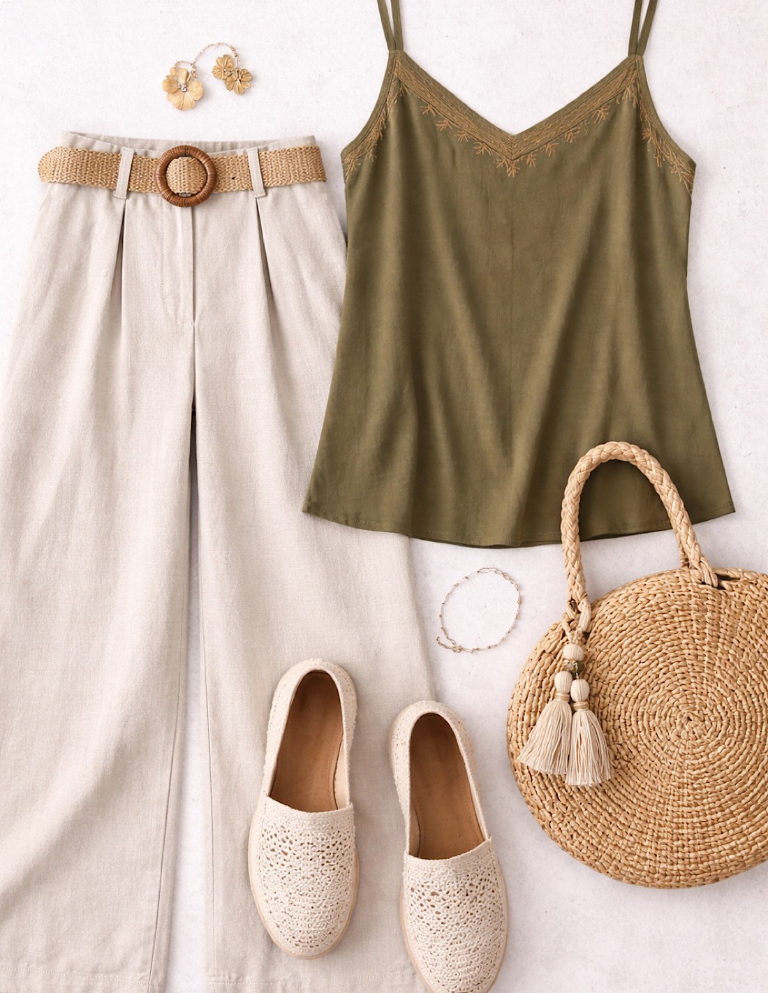 Polyvalent et tendance, ce débardeur bohème kaki s'associe facilement avec un pantalon large beige, un jean, un short ou une jupe fluide pour créer un look naturel et élégant. Il peut se porter seul lors des journées chaudes ou sous une veste légère pour une tenue plus sophistiquée.