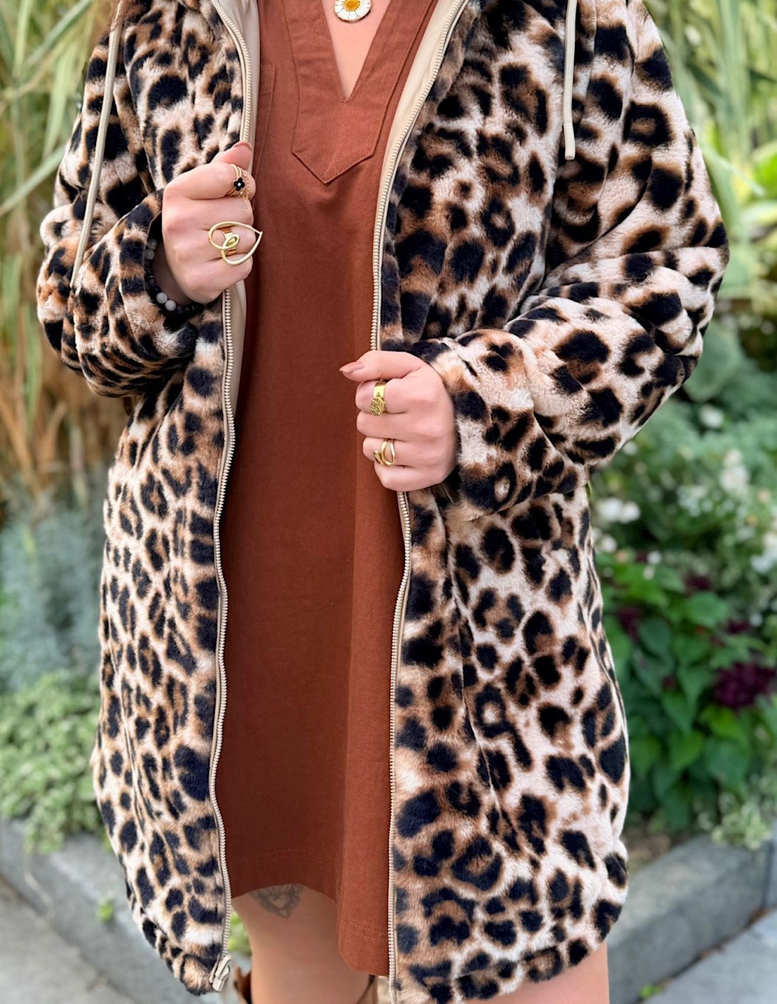 Le revers en fourrure synthétique léopard apporte chaleur et douceur, parfait pour la mi-saison ou les journées plus fraîches.
