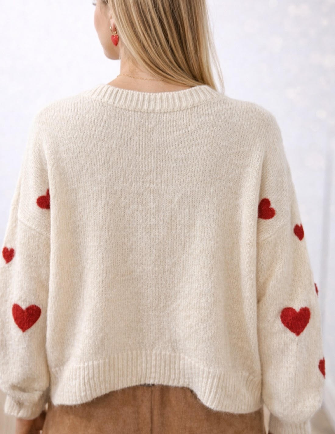 Adoptez un look doux et romantique avec ce pull femme crème "AMOUR " à cœurs rouges.