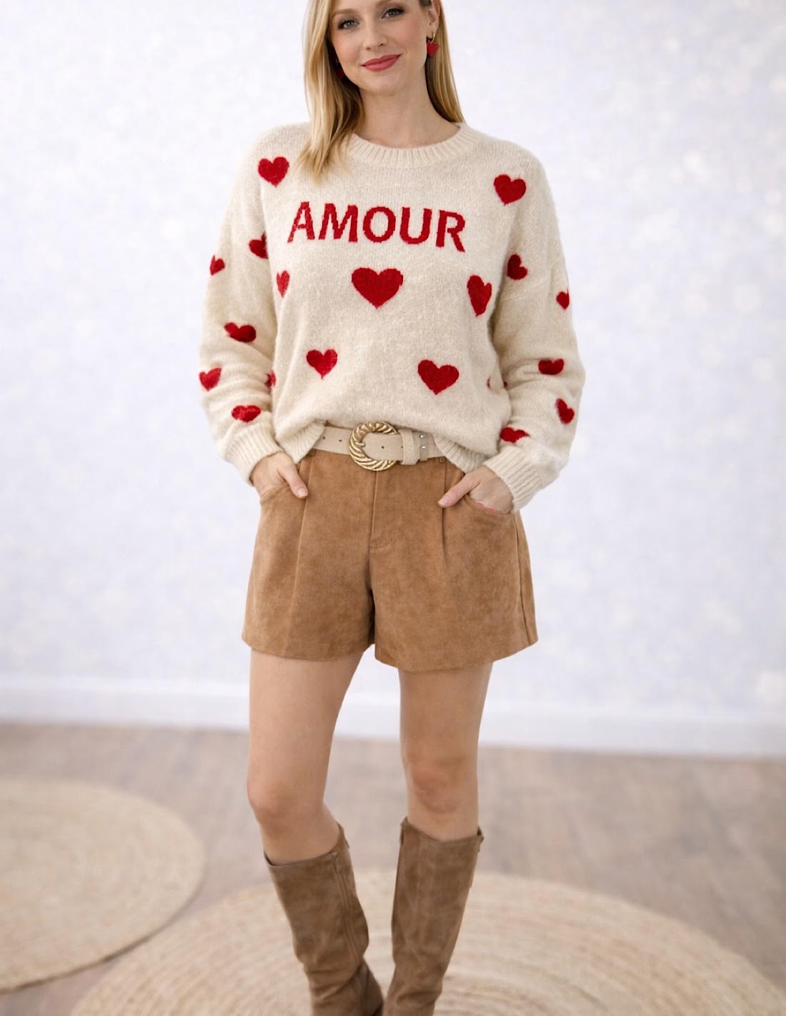 Succombez au charme de ce pull femme crème " AMOUR " à cœurs rouges, une pièce incontournable pour un look à la fois romantique, tendance et confortable.
