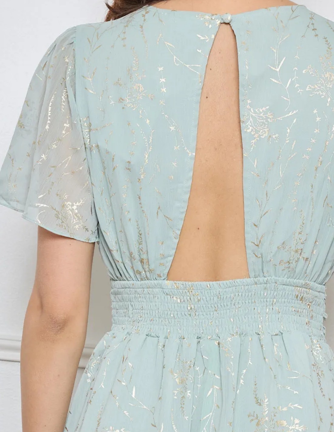 Les manches papillon apportent une touche aérienne et romantique, tandis que le motif doré délicatement imprimé sur l'ensemble de la robe offre une subtile note d'éclat.