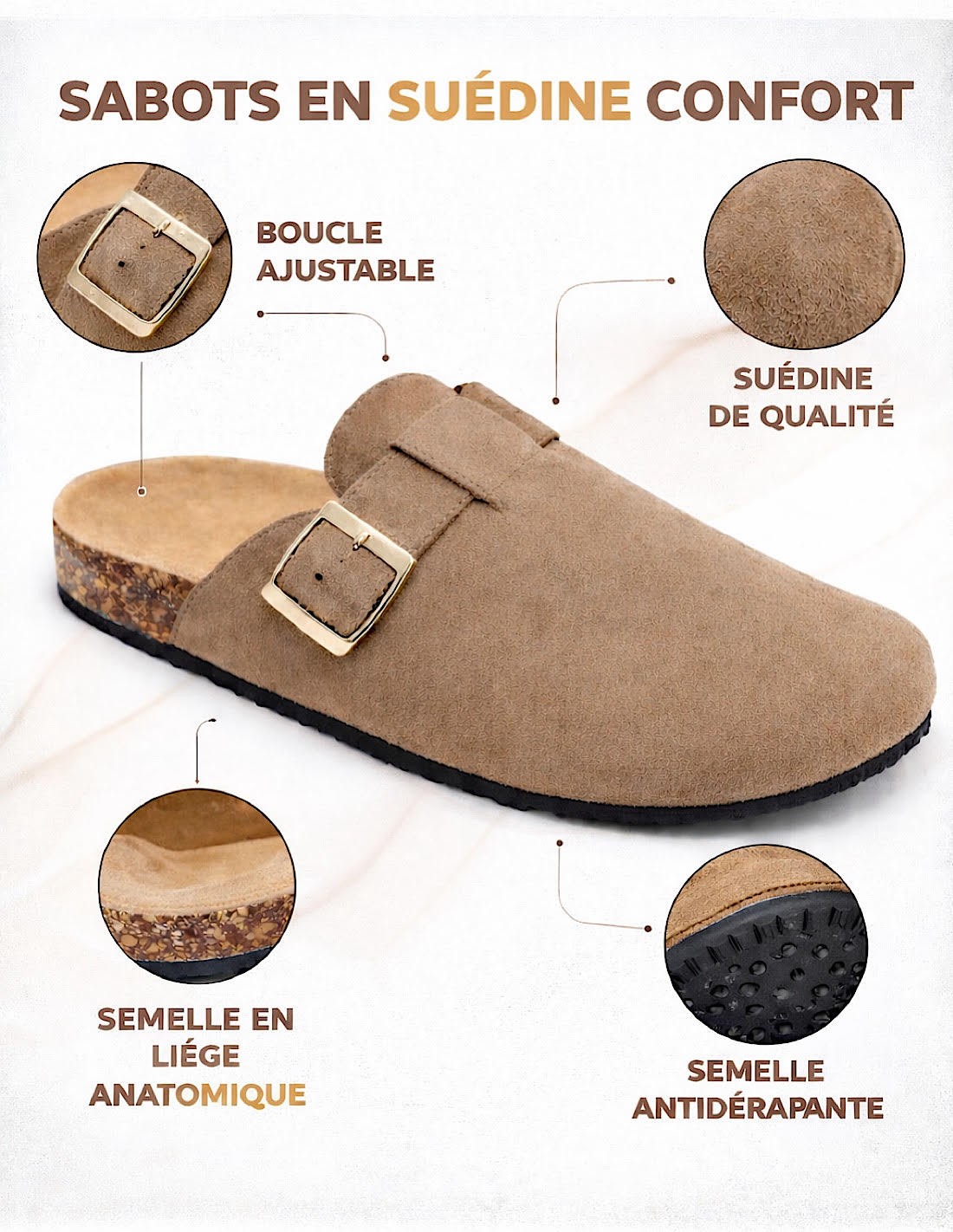 Sabots femme confort anatomique en suédine, conçus pour offrir un maximum de bien-être au quotidien. Ces mules femme allient style tendance et confort grâce à leur semelle ergonomique en liège qui épouse la forme du pied et assure un excellent maintien.