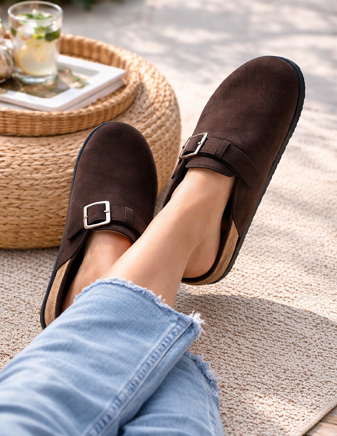 Sabots femme confort anatomique en suédine, conçus pour offrir un maximum de bien-être au quotidien. Ces mules femme allient style tendance et confort grâce à leur semelle ergonomique en liège qui épouse la forme du pied et assure un excellent maintien.